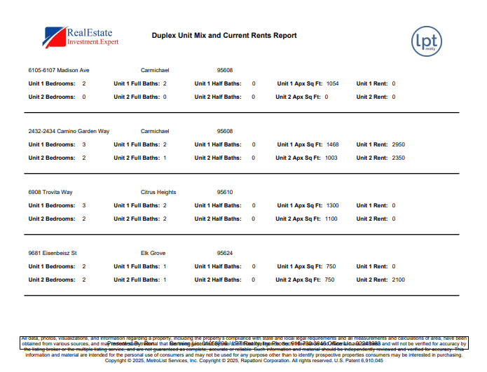 The 30-day Market Trend Reports for Duplexes and Fourplexes is a good companion to our GRM Reports. The 30-day market Trends Report will help keep you on top of the Micro Trends as they appear. Market Changes Leave Evidence. With these reports and our other tools, you will be making “Smart Moves” Long before “The Street” (Average Investors) see the market changes you will already know about!